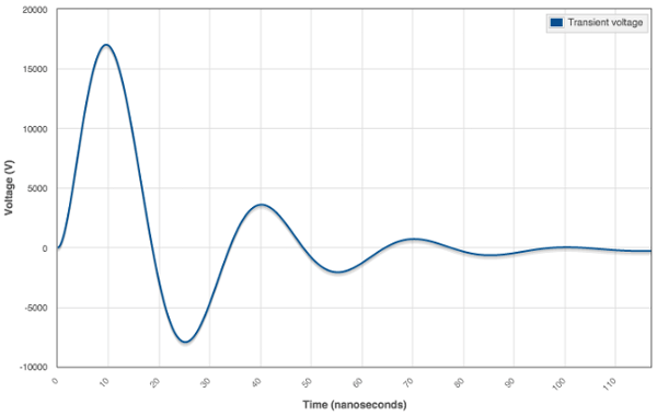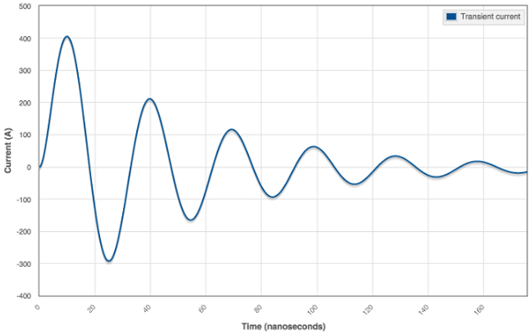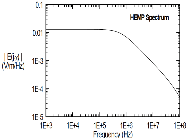 Using the parameters defined by Carl Baum, by IEC or in the MIL-STD-464 leads to the equivalent double exponential transient High Altitude Electromagnetic Pulse as shown below. The frequency spectrum of this transient is also shown.